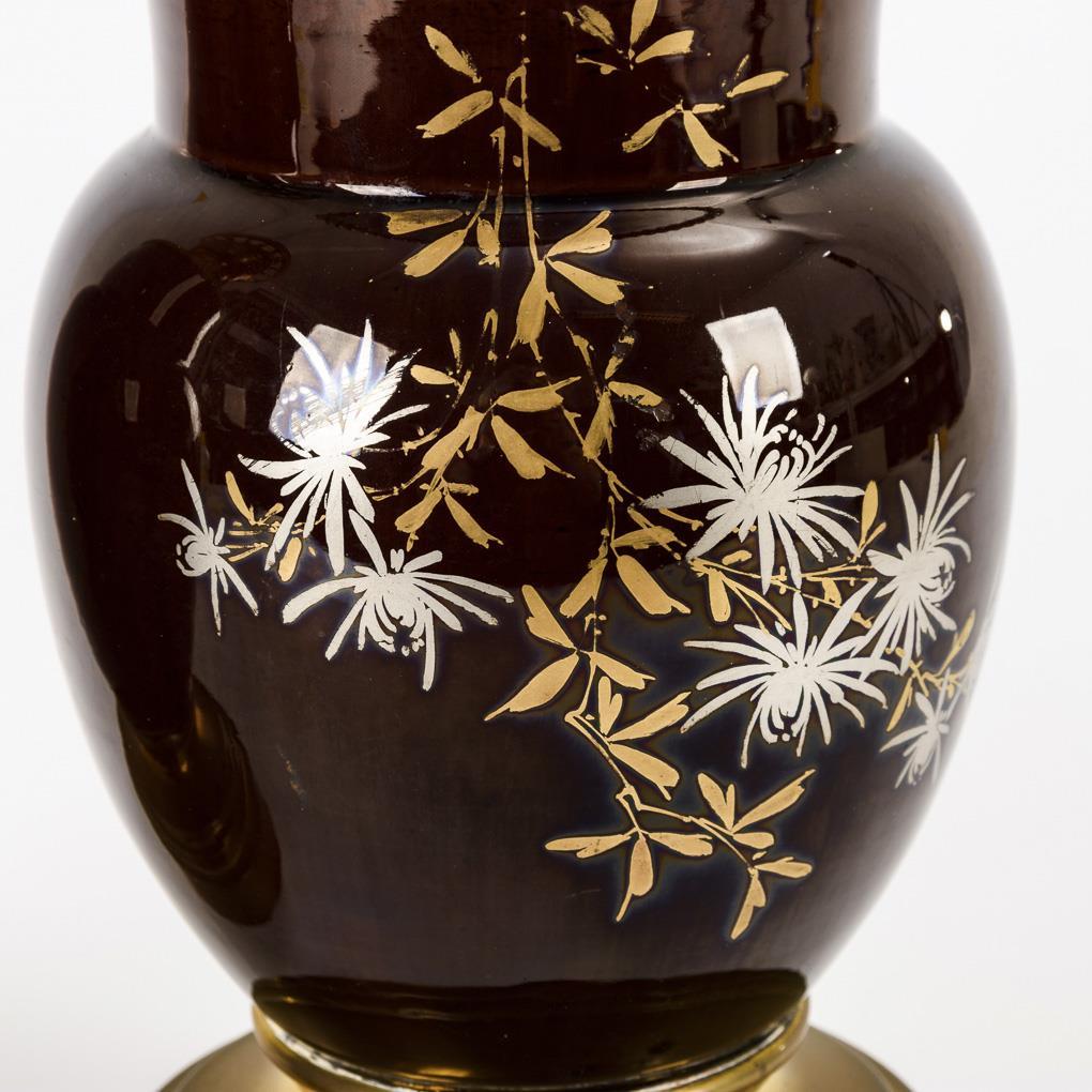 Brass, brown glazed ceramic with gold/silver staffage, clear glass. H 32 cm (without chimney).