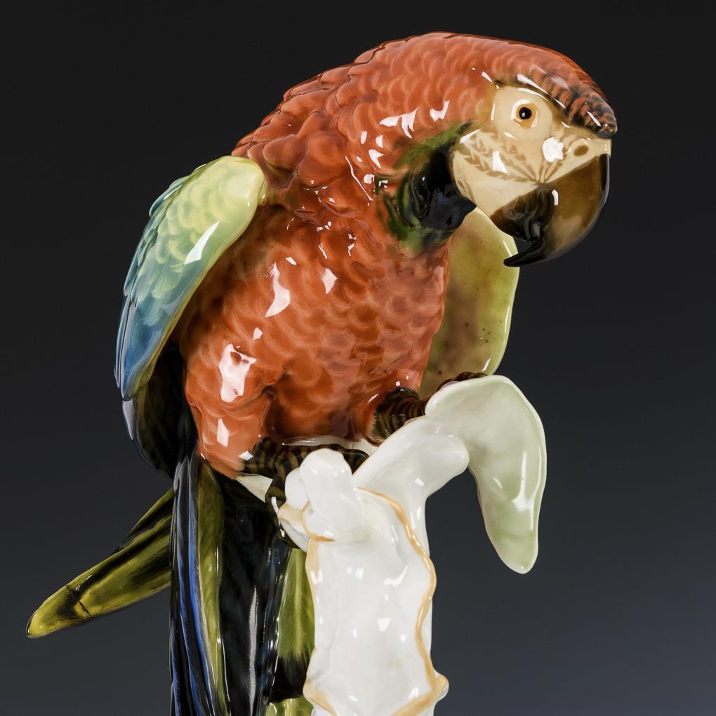 Parrot. 1 wing tip glued sitting on a high tree trunk.