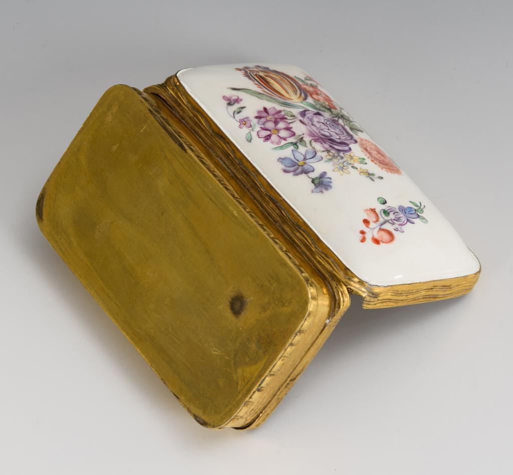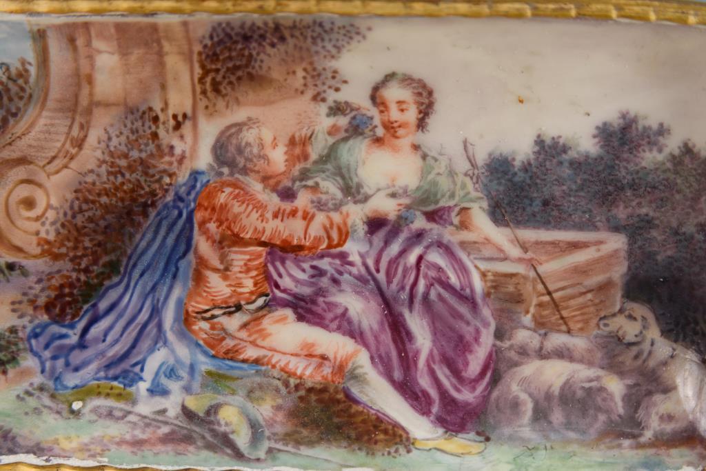 Rechteckige Metalldose mit gewölbtem Porzellandeckel, dieser mit Blumenmalerei sowie einer Schäferszene im Deckelinneren. Deckel restauriert.