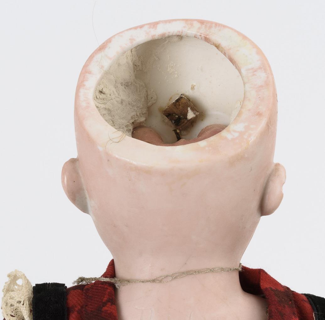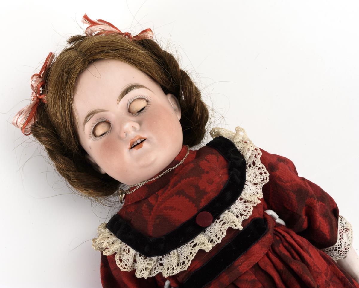 Chest head, blue sleeping eyes, brown human hair wig with braided hairdo. Leather body with bisque forearms, cloth knee gussets and lower legs. Red dress with black velvet and white lace trim, black shoes. Hair crack spider at the back of the head.
