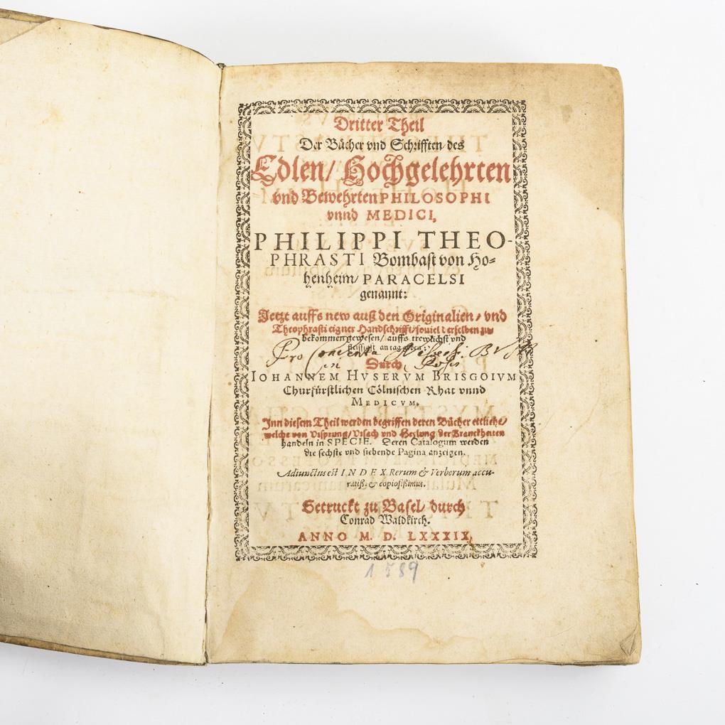 "Within this part are comprehended their books some what origin/cause and cure of the diseases act ind SPECIE". "Now onfs new auß den Originalien .... durch Johannem Huserum Brisgoium".