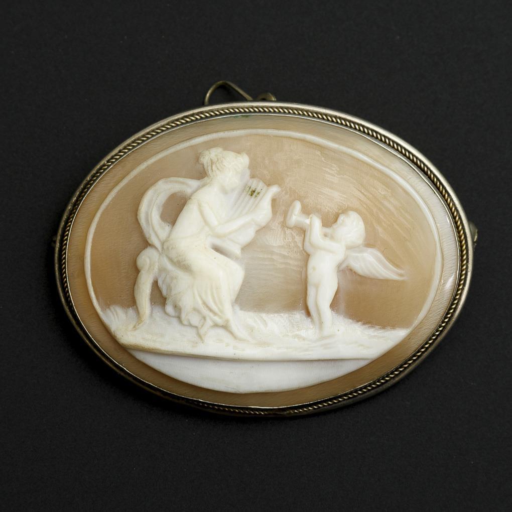 Shell cameo with cut motif of a woman with lyre and putto, in bezel setting. Ball hook and eye.