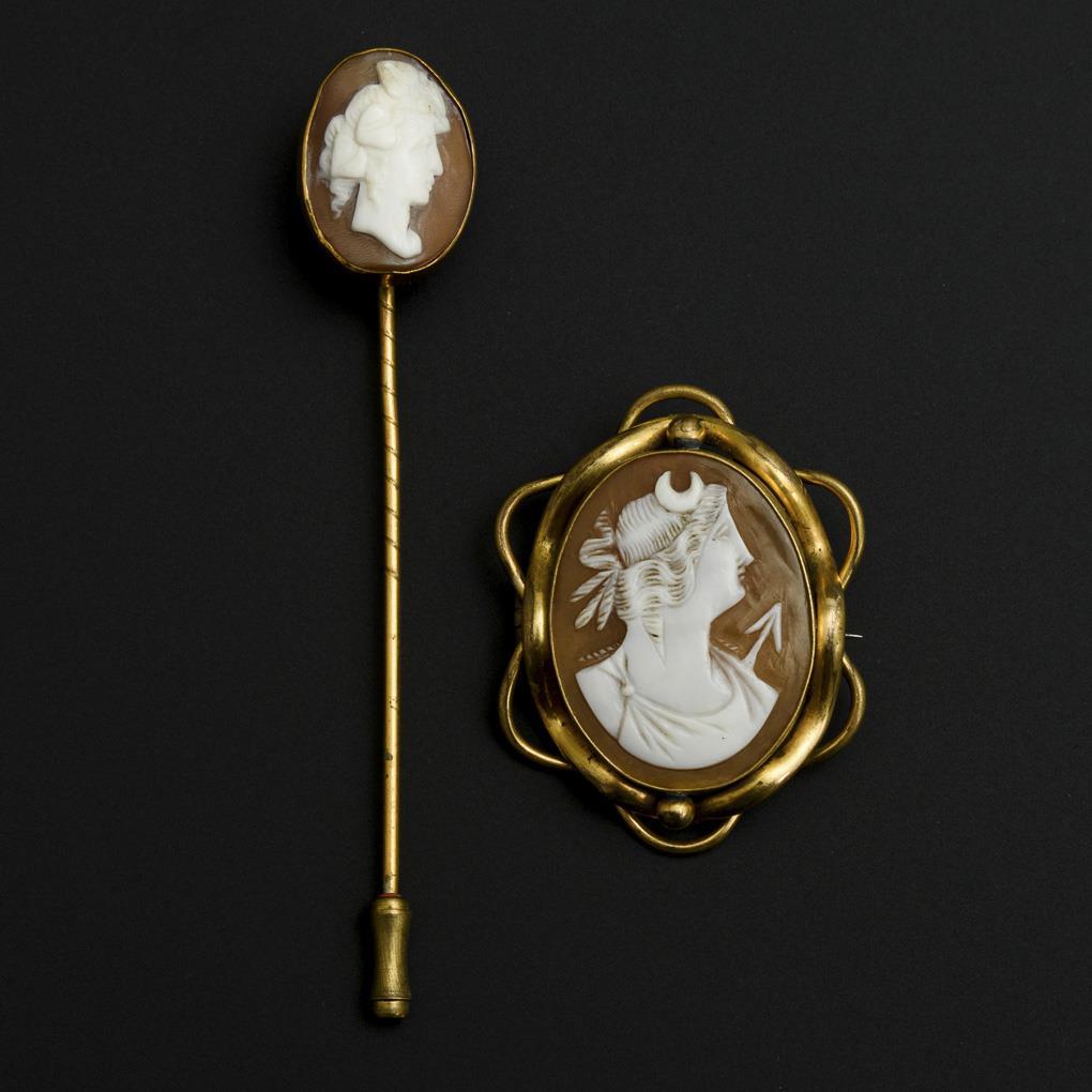Brooch and lapel pin with shell cameos.