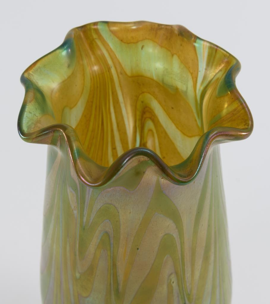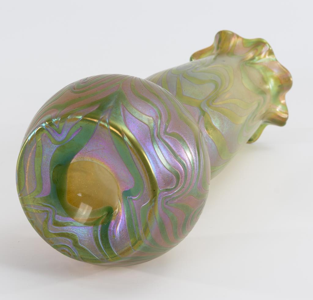 Farbloses, irisiertes Glas mit aufgewalzten, gekämmten silbergelben und grünen Fäden.H 26 cm.