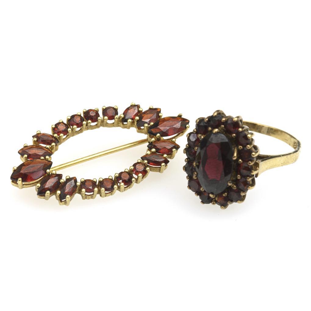 Brooch and ring set with garnets. Ball hook. Narrow rail.