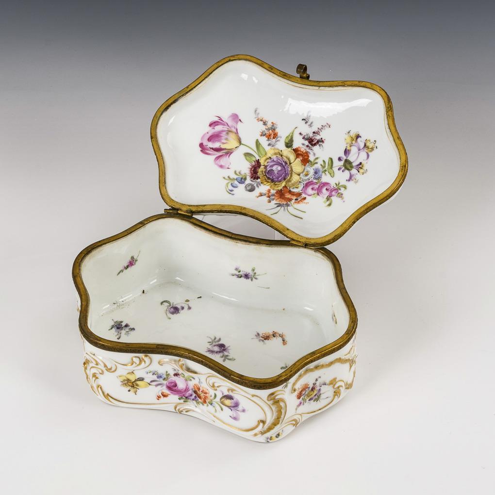 Six-sided box with rocaille relief and metal mounted hinged lid. All sides painted floral bouquets and scattered flowers. 1 hinge defective, in the lid small hairline crack in the glaze.