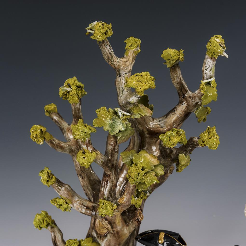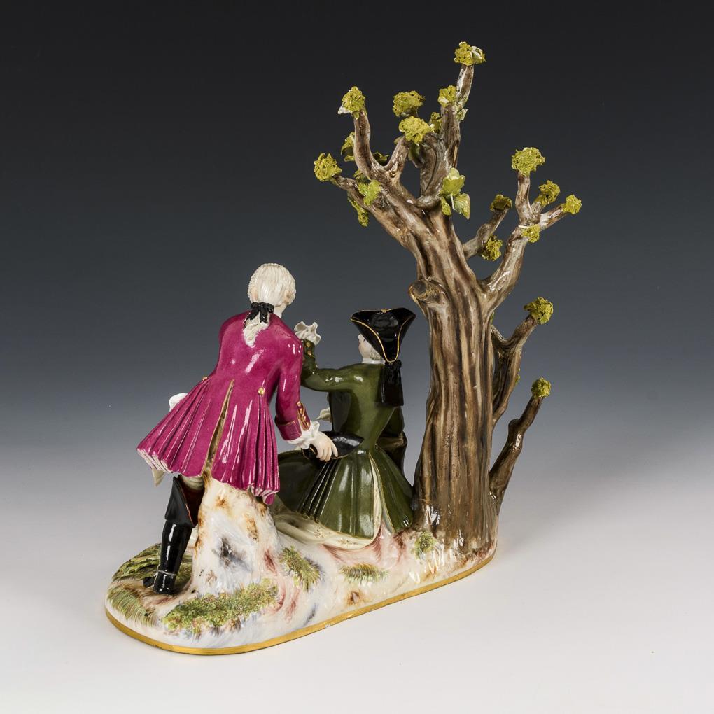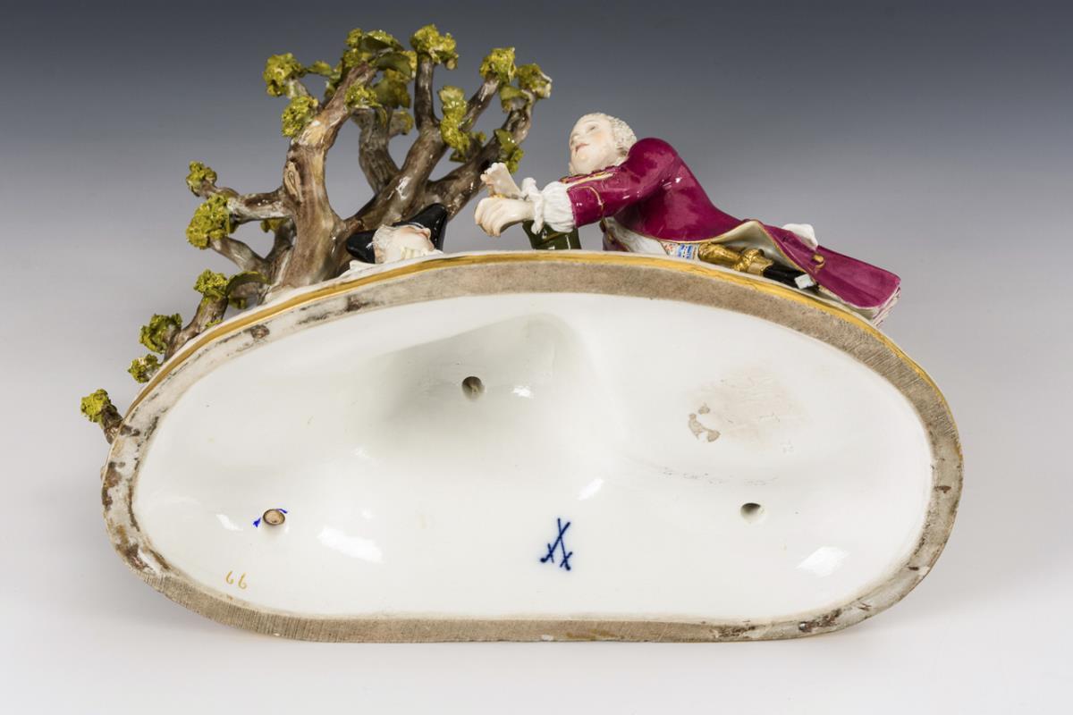 Huntress sitting under a tree as well as a gentleman handing her snuff. Left hand of the lady defective, tree trunk restored, lid of the tabatiere missing, bumps on the leaves, rapier bumped.