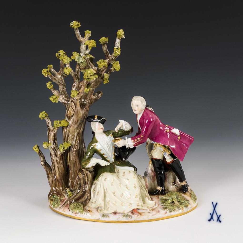 Huntress sitting under a tree as well as a gentleman handing her snuff. Left hand of the lady defective, tree trunk restored, lid of the tabatiere missing, bumps on the leaves, rapier bumped.