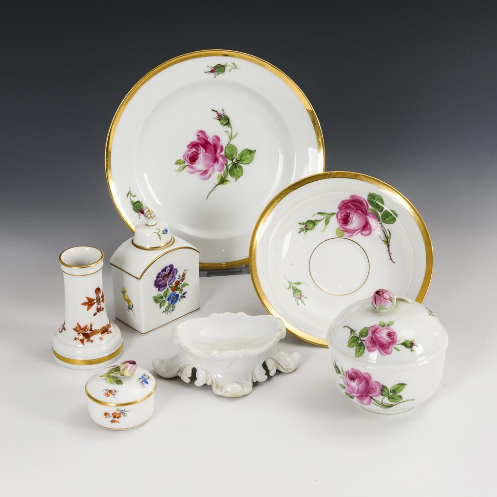 3x "Red Rose": sugar bowl (h 9 cm), saucer (Ø 14,5 cm), plate (Ø 18,5 cm). / 2x flower painting: tea caddy (h 9,5 cm) and small box (h 4,5 cm). / 1x vase with red dragon painting (h 8 cm). / 1x white rocaillesaliere (L 11 cm). Plate with glaze hairline cracks on the underside, rose knobs bumped.