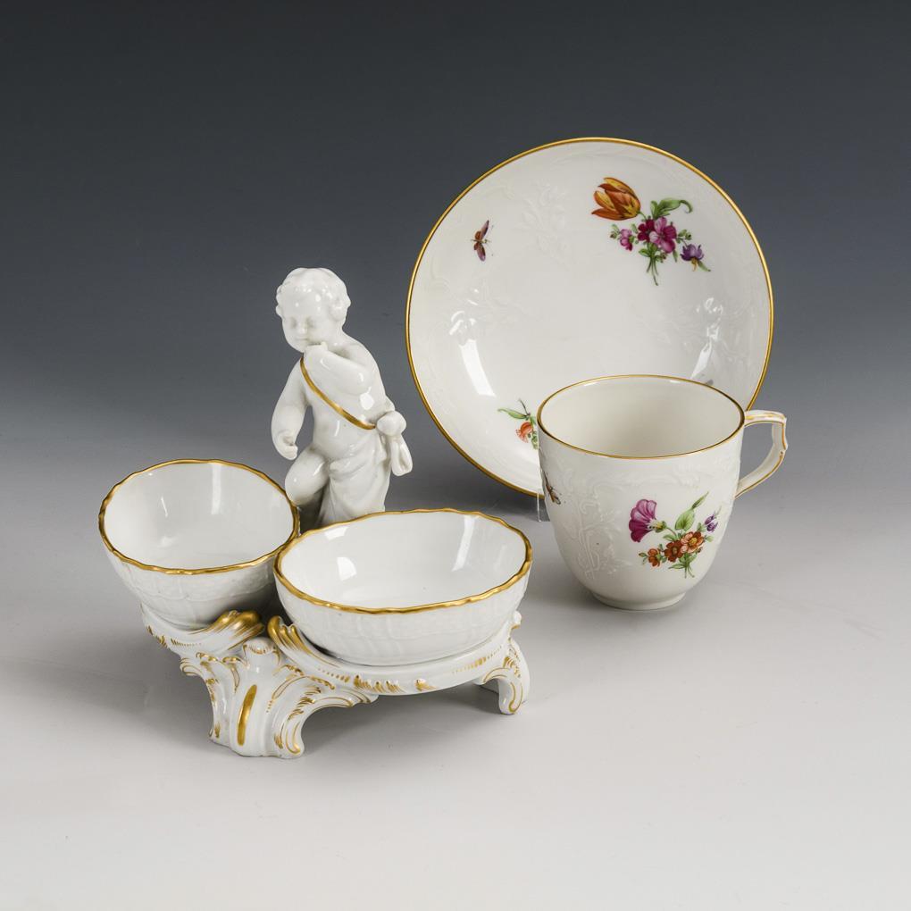 1x model "Neuzierat": cup (h 6 cm) and saucer (Ø 12 cm) with floral painting. / 1x model "Neuosier": at two spice bowls standing, licking his finger Putto.