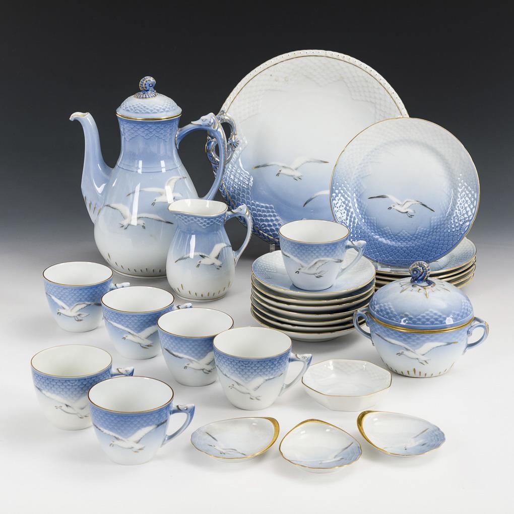 28 pieces. Coffee pot (h 23,5 cm), creamer, sugar bowl, 7 coffee cups, 7 saucers, 6 cake plates, 1 credenza plate (Ø 27 cm), 3 shell bowls (Ø 9 cm) and 1 polygonal bowl (Ø 9 cm). 2 cups with hairline crack.