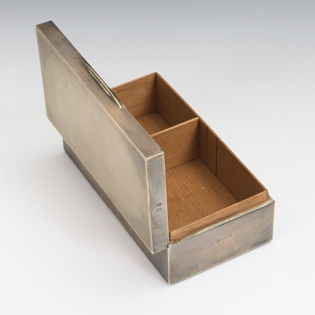 Fine wave engraving, wood-lined interior with divider. Slight signs of age and wear.