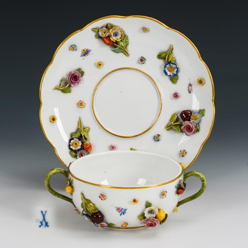 Polychrom bemalt, goldstaffiert.Ø Suppentasse 12 cm, Ø Unterteller 19 cm.