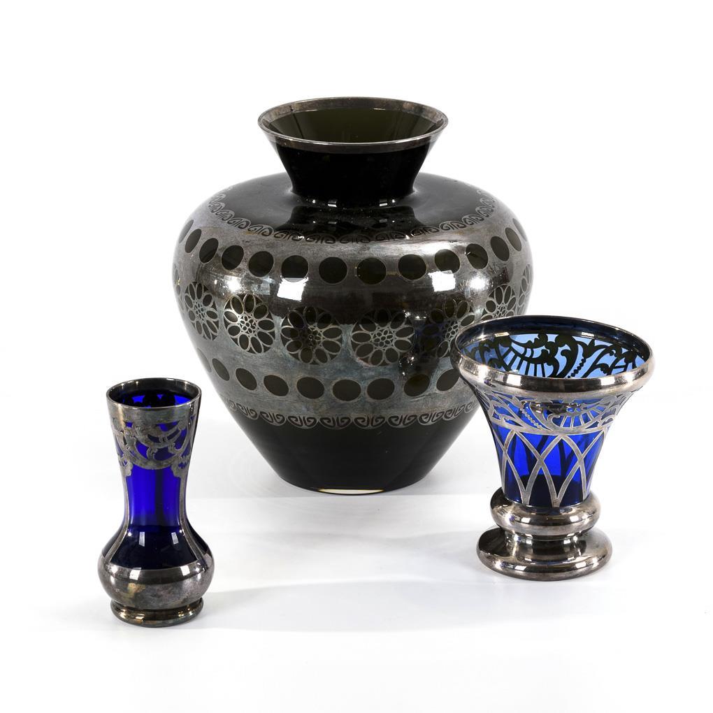 Baluster vase with floral-geometric overlay (h 22 cm), crater vase with rocaille motif (h 12 cm) and small vase with vegetal overlay.