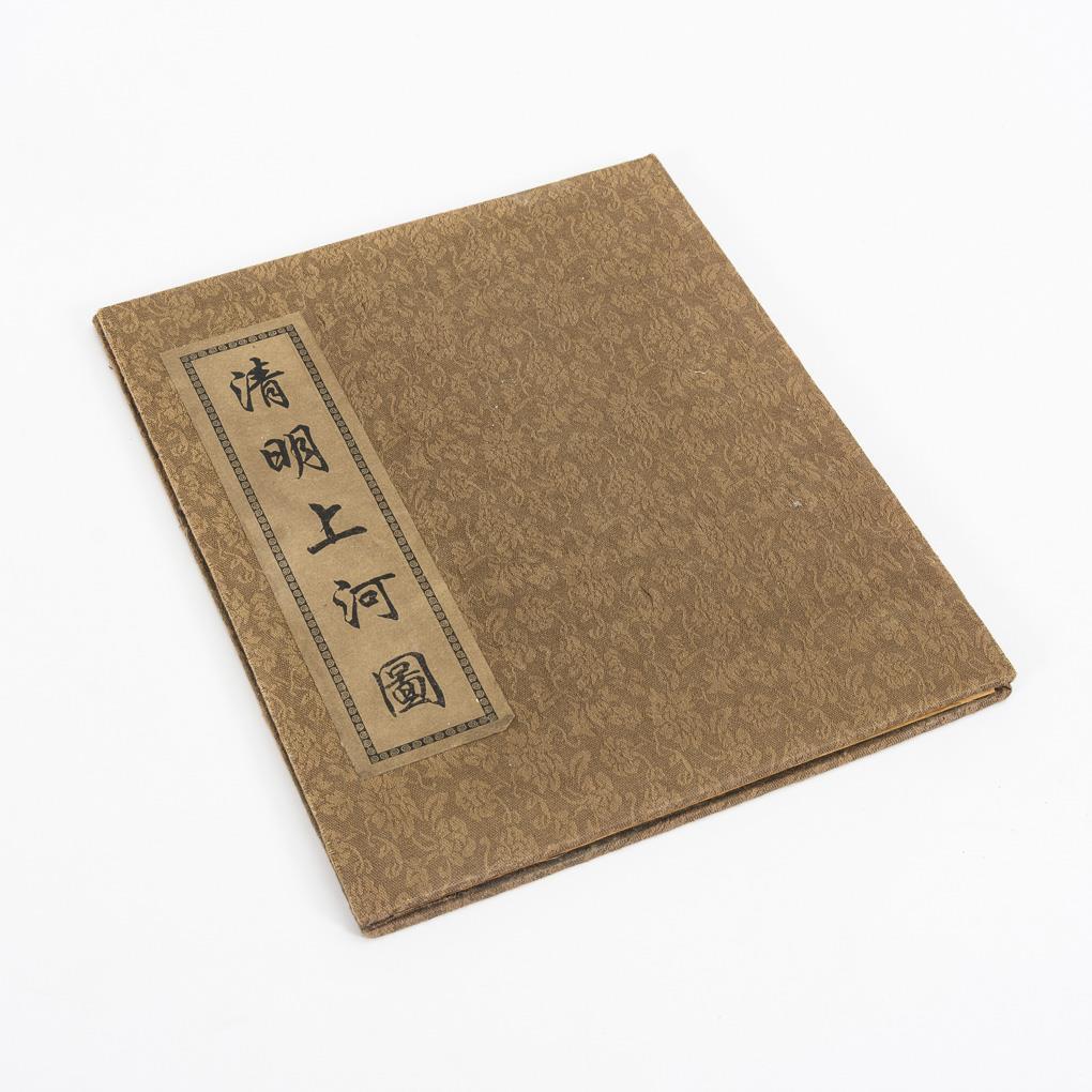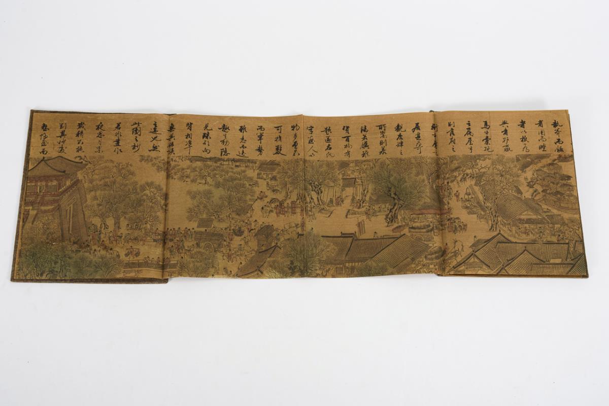 Detailed depiction of the city of Kaifeng on the Day of the Dead. River depiction with numerous ships and boats, caravans, inns, workshops and numerous everyday scenes. Fabric in brown ground tone, printed in black, partly faintly colored, continuous text. Good state of preservation at the top.