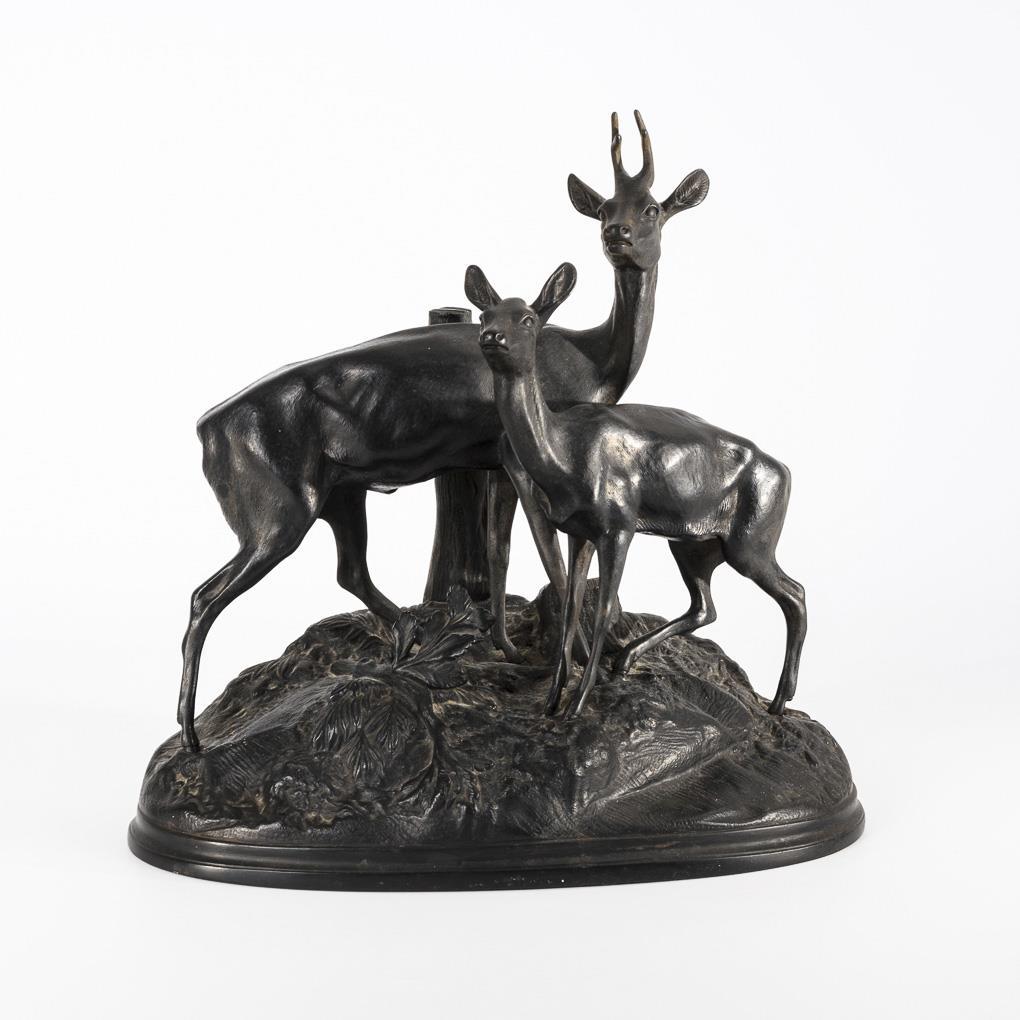 Naturalistic depiction of roebuck with doe looking in one direction.