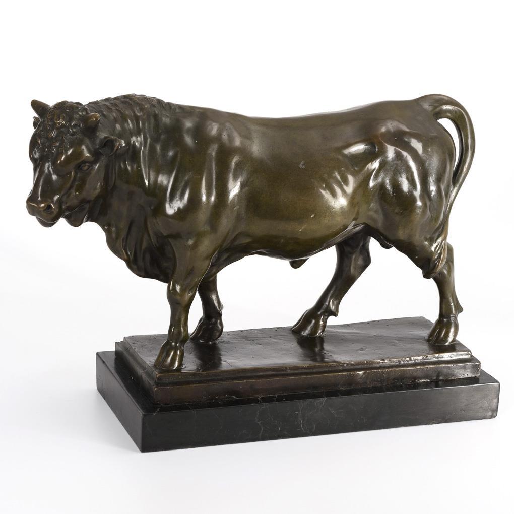 Magnificent bull with head turned slightly to the side. Somewhat spotty patina, marble repaired (bronze plinth partly painted black).