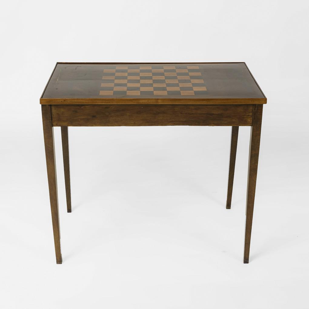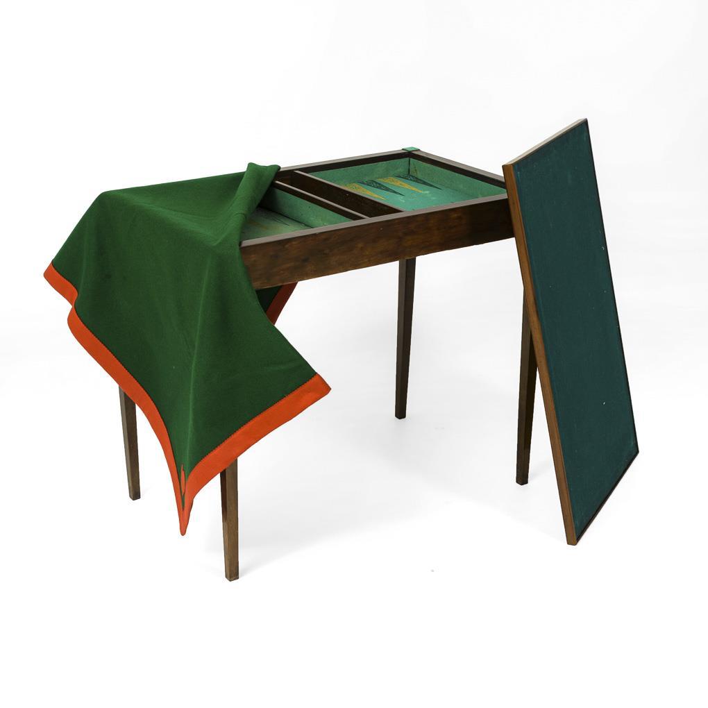 Rectangular game table on 4 pillar legs, reversible and removable table top (top with marked chess board, bottom with green velvet cover); inside lined with velvet and decorated with backgammon game board, divided into 3 compartments; plus a complete chess set with pieces made of wood and game cover made of green felt with red border. Signs of age/use.