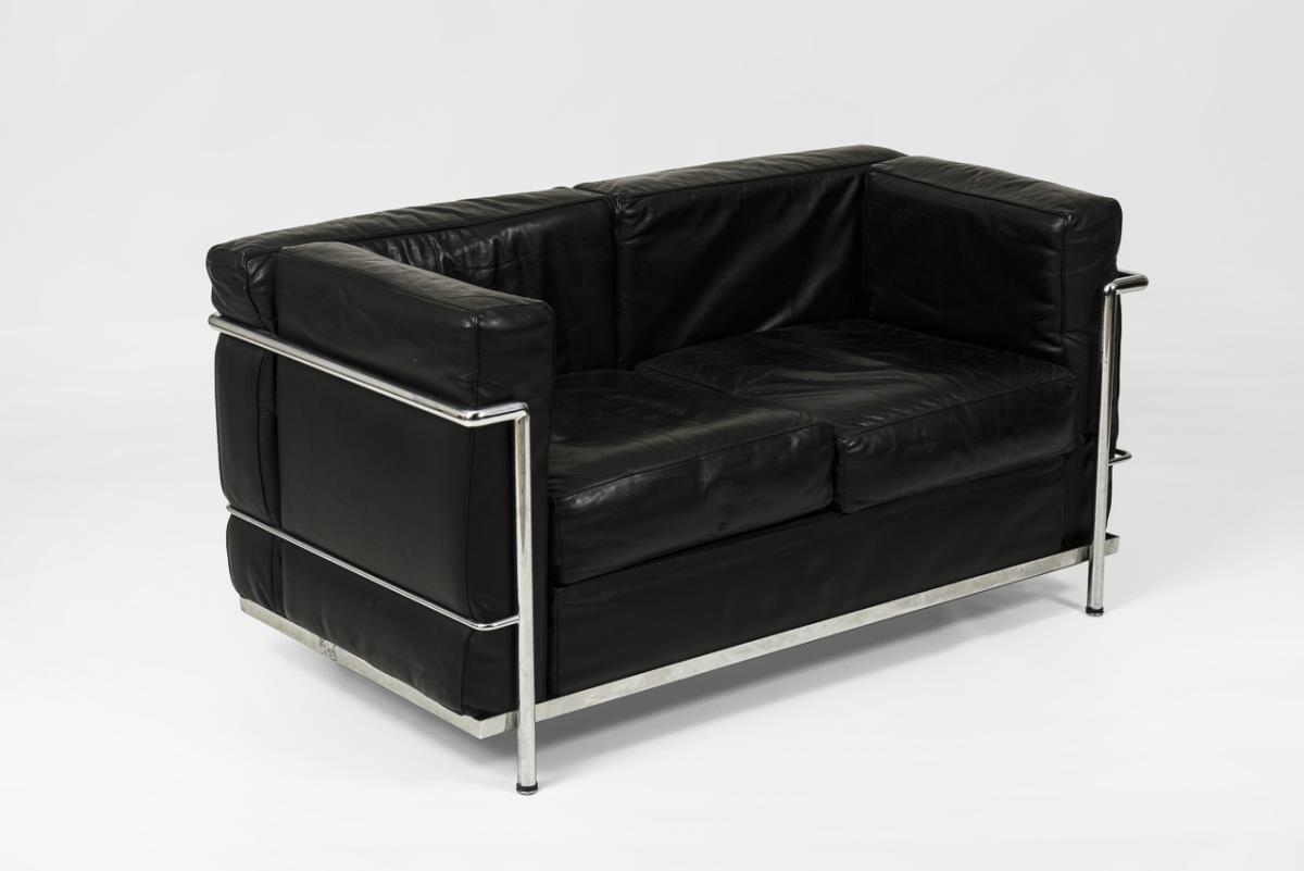 2-seater sofa from the LC series in cubic design with steel frame and leather upholstery - designed by Le Corbusier, Pierre Jeanneret and Charlotte Perriand in 1928; is one of the most famous models of the LC series.