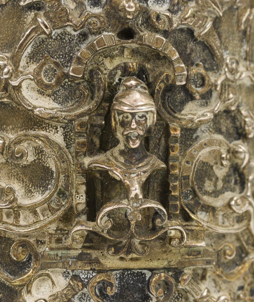 Small wine jug with engraved inscription and lidded box with putti decoration. Small missing parts on the jug.
