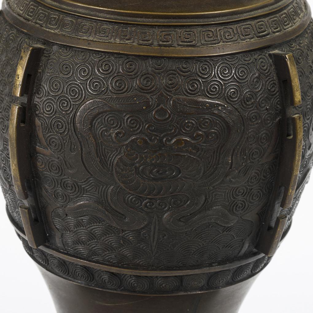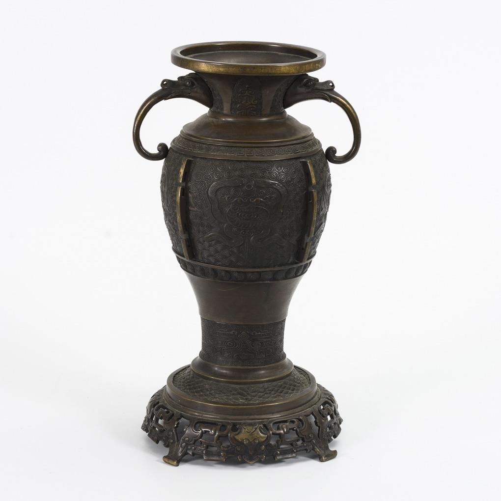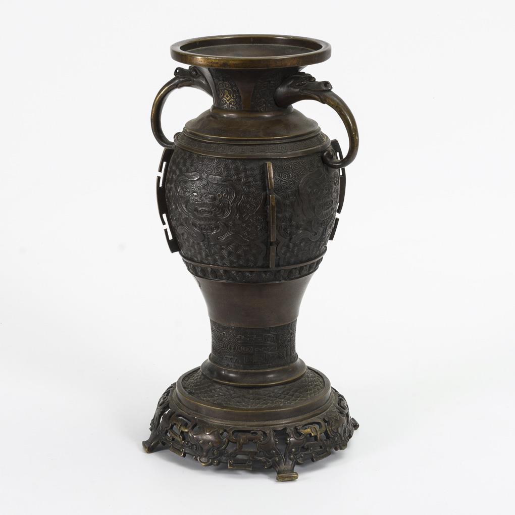 Bronze vase with animal head handles.