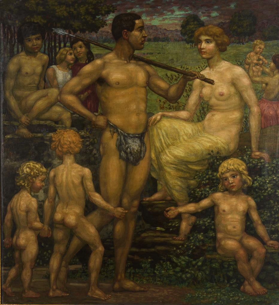 Young man with spear in eye contact with a naked young woman as well as surrounded by children in wide meadow and forest landscape. Light traces of age.