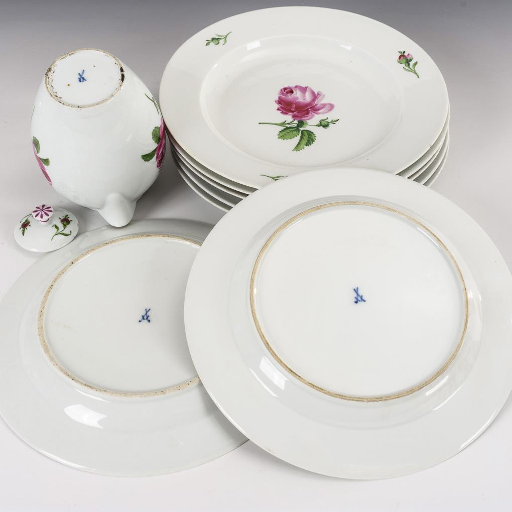 7 plates and 1 pot "Red Rose". Meissen.