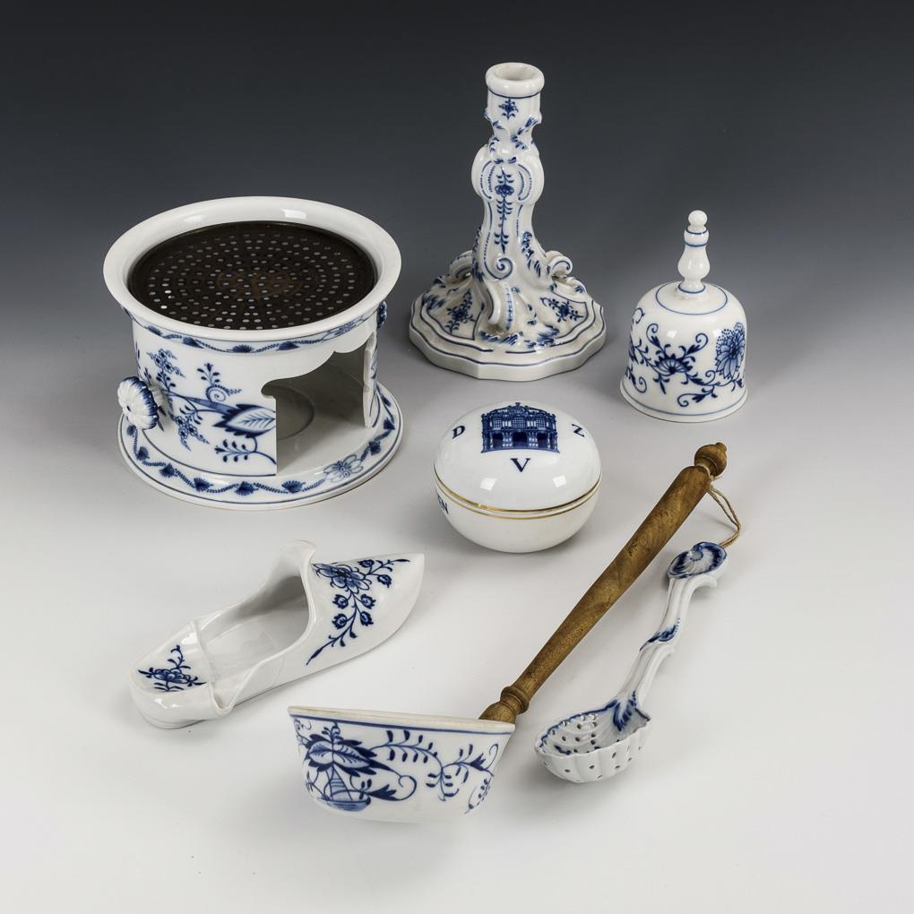 Teapot warmer with two handles and metal strainer (h 11 cm), rocaille candlestick (h 18 cm), table bell, ornamental shoe, serving spoon, ladle and box with kennel view.