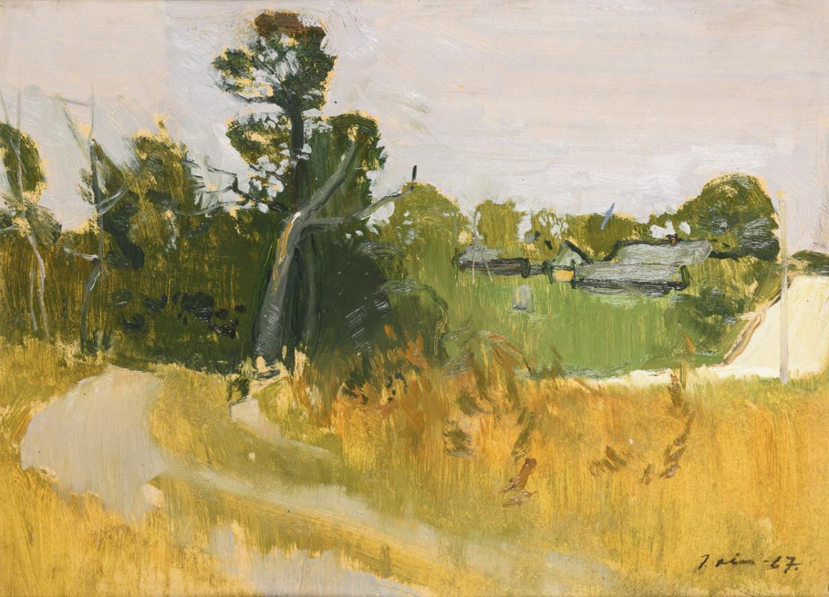 Expressively painted landscape with homestead under grey sky.