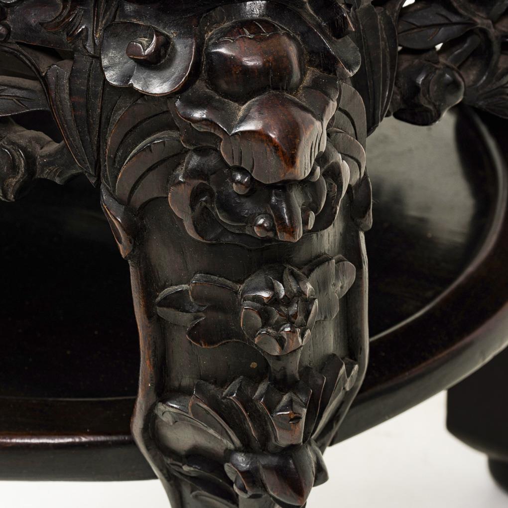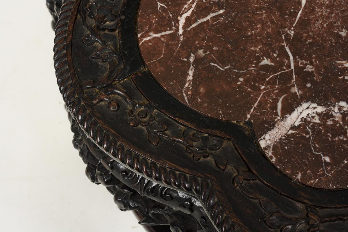 Lushly decorated, representative side table with inset, flower-shaped marble tabletop in wooden frame, on 4 curved legs, with shelf; plastic carving of grotesques, acanthus leaves and floral tendrils. Traces of age/use.