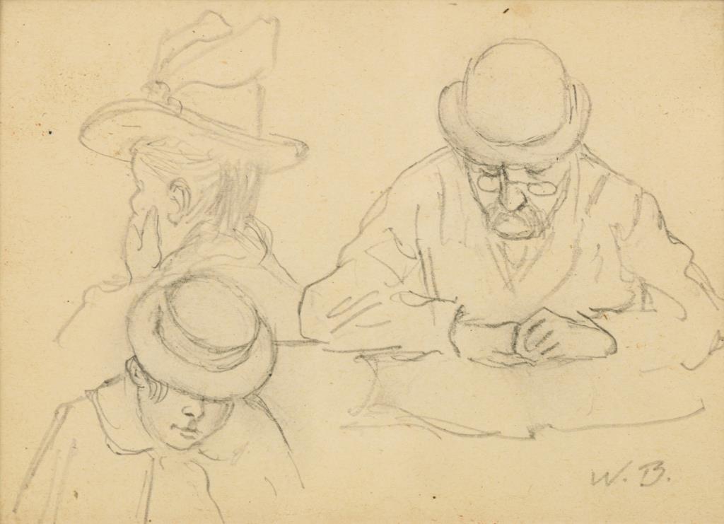 Bleistiftskizze mit jüngerem Mann, älterem Herren und Dame.