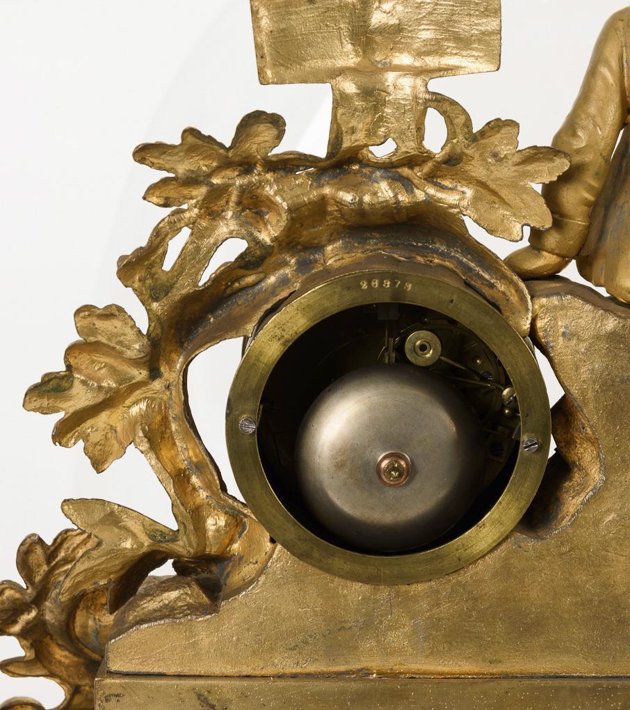 Openwork decorated base in Louis Seize style with crowning sculpture of a hunter with shotgun and killed hare. On ebonized wooden base with glass lintel. Shotgun broken and glued, dial cracked, hands supplemented, rubbing, signs of age and use.