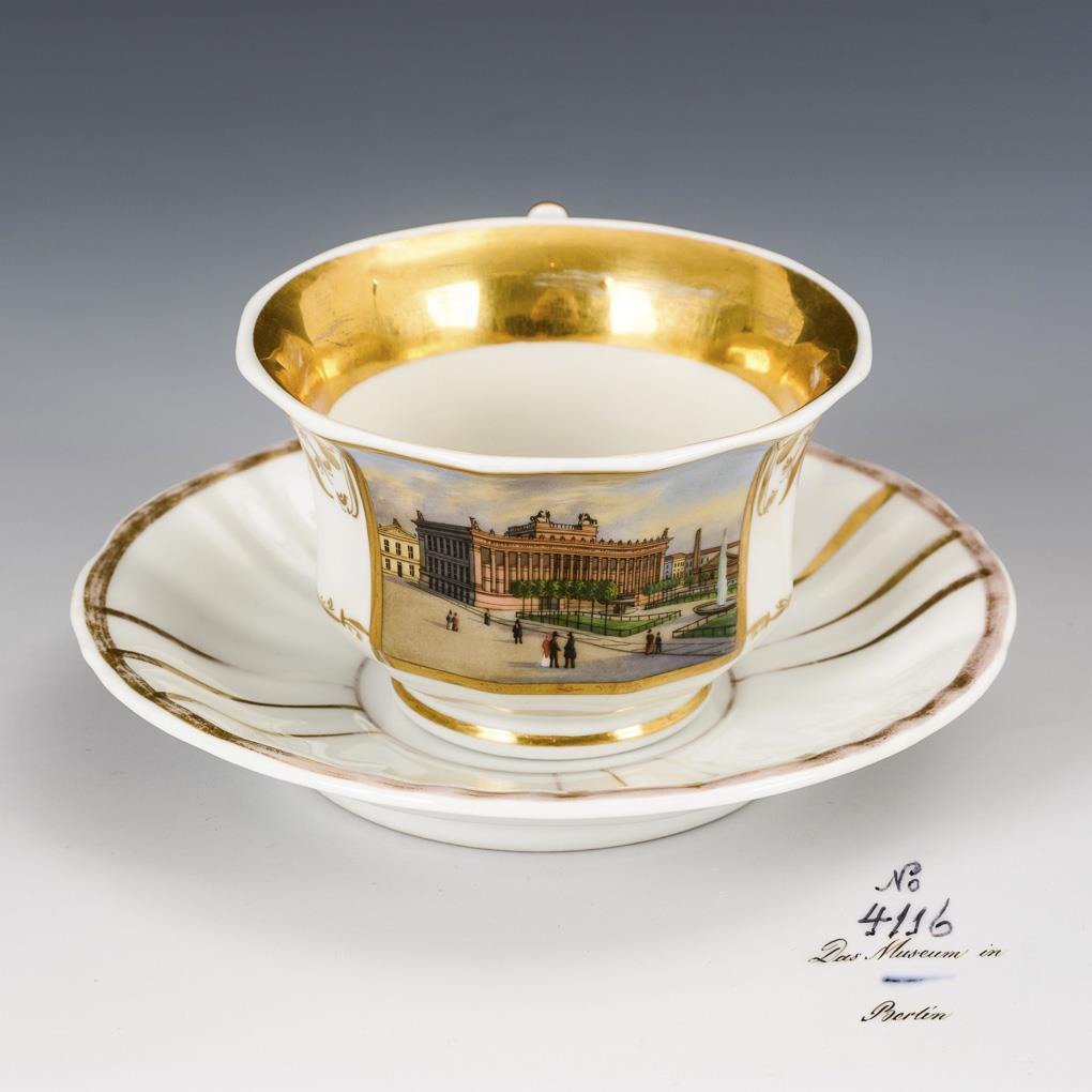 Polygonal, footed bell cup with pointed curved handle. On the front a gold-framed rectangular cartouche depicting the Altes Museum in Berlin. Minimal gold wear.