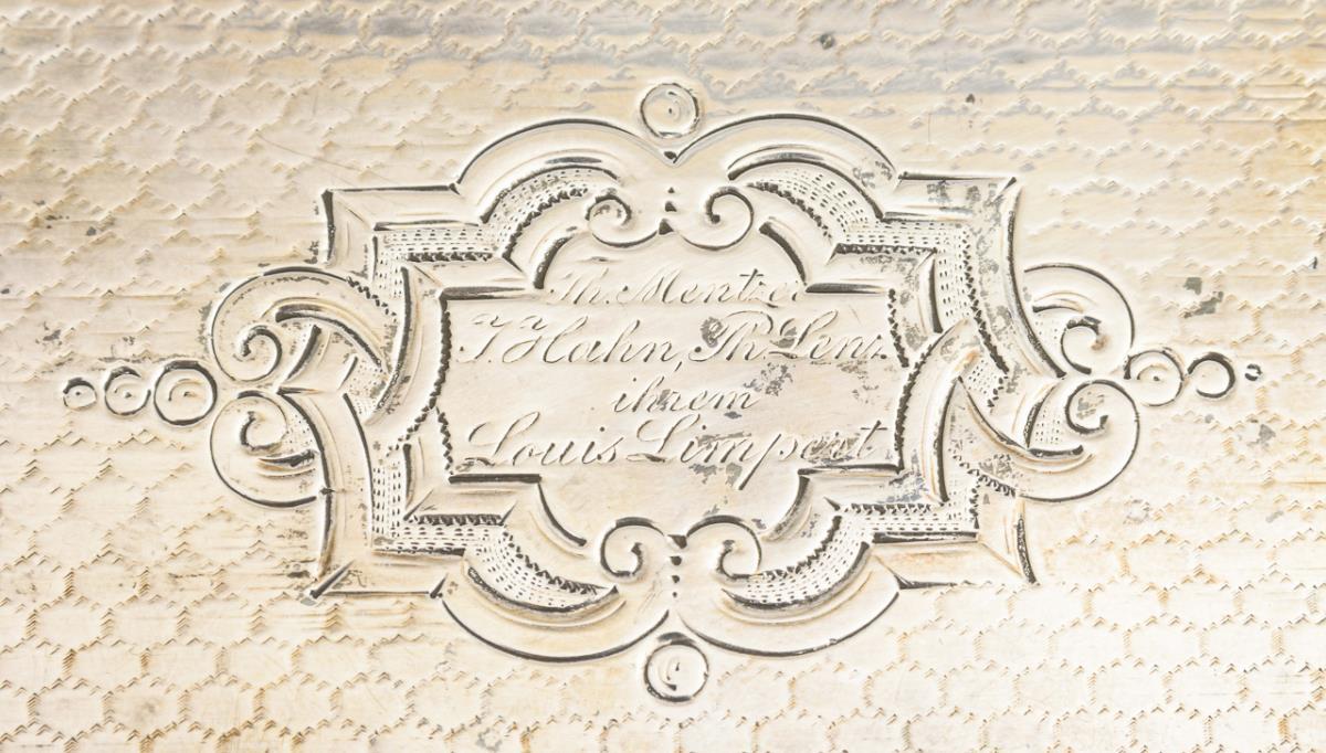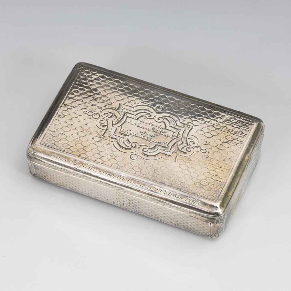Guilloche box with engraved dedication on hinged lid. Signs of use, small dents, surface worn.