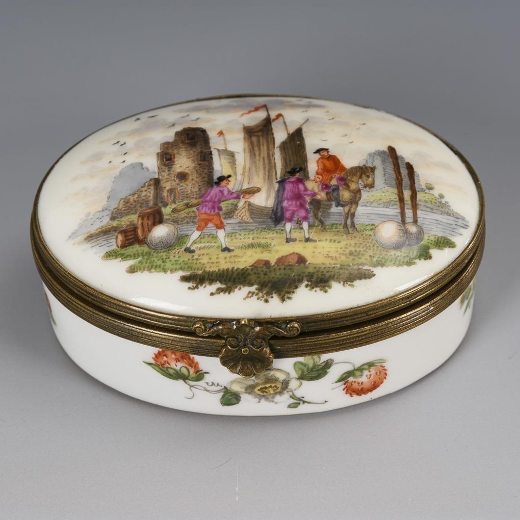 Oval box with metal mounted hinged lid. On the inside and outside of the lid a coastal landscape with barrels, bales and merchants, on the underside of the body a bouquet of flowers and fruit. Lid restored.