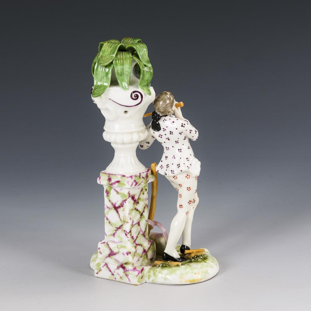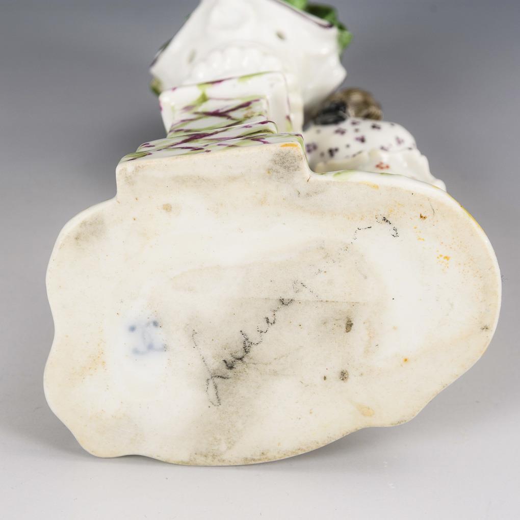 Rococo gentleman standing at a pedestal with vase, offering wood for sale. Legs and leaf tips restored.