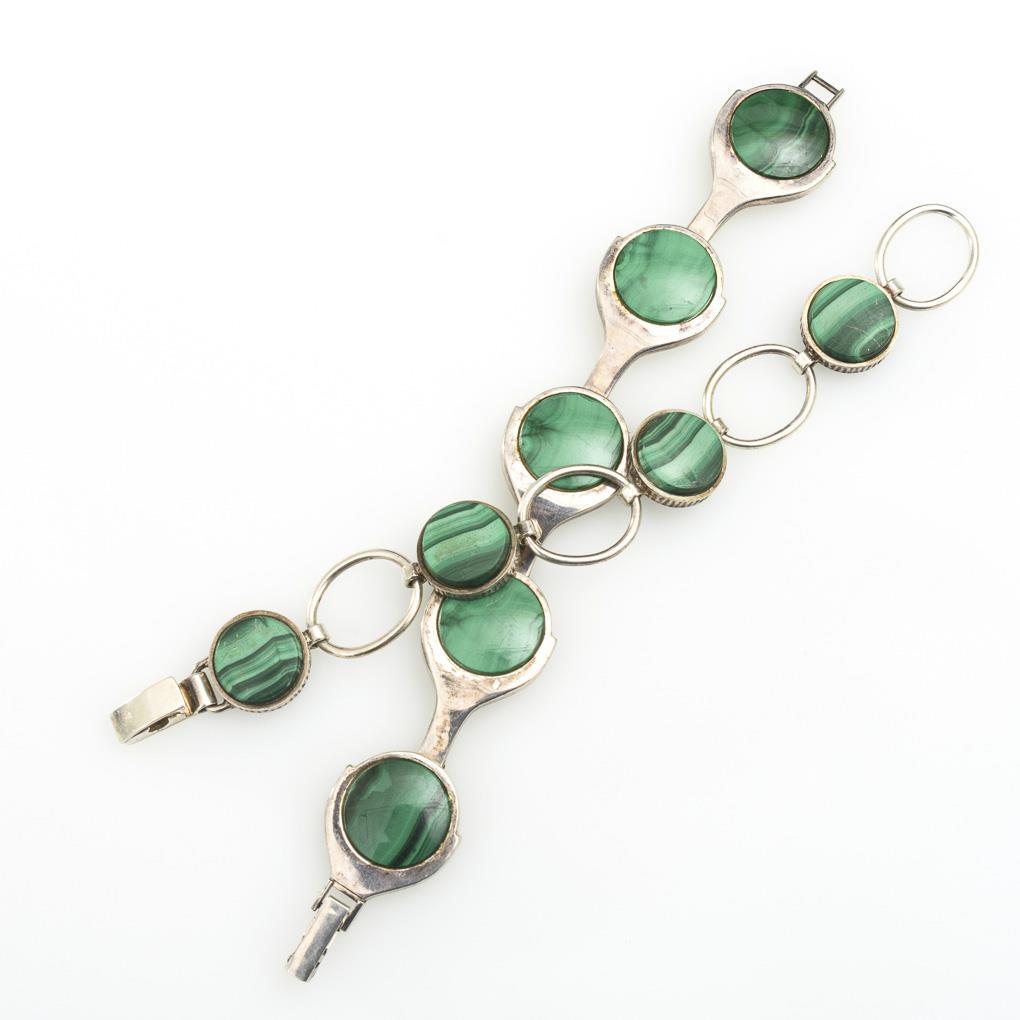 Bracelets with casket-set malachite discs on clip clasps.