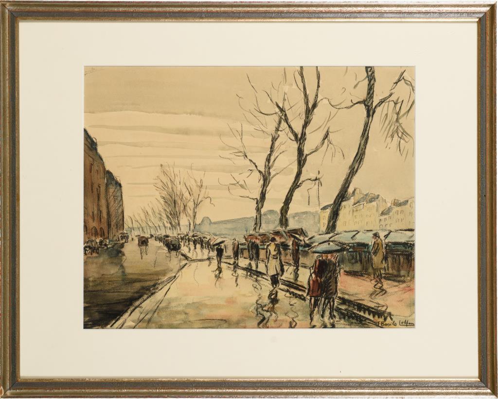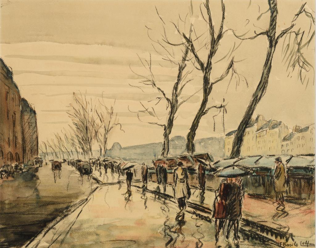 Viele Menschen im Regen auf der Straße oberhalb der Seine.