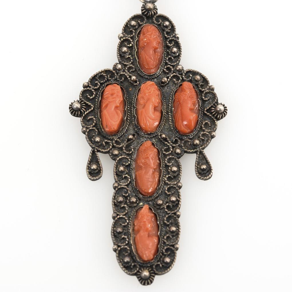 Ornament pendant/brooch with onyx inlays and marcasite set. Rigid eyelet and ball hook. Cross pendant with 6 cut corals and filigree.