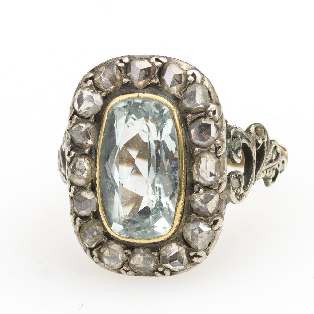 Ancient entourage ring with aquamarine and diamond roses.