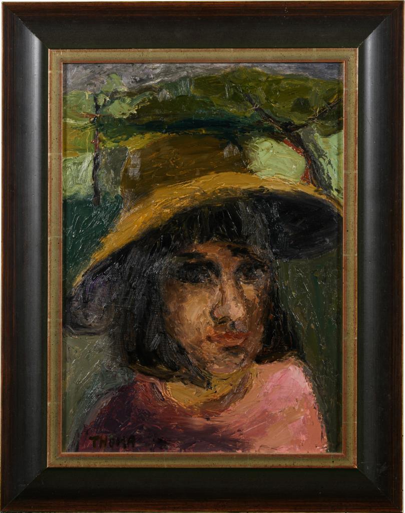 Bildnis eines Mädchens mit dunklen Haaren und Hut.