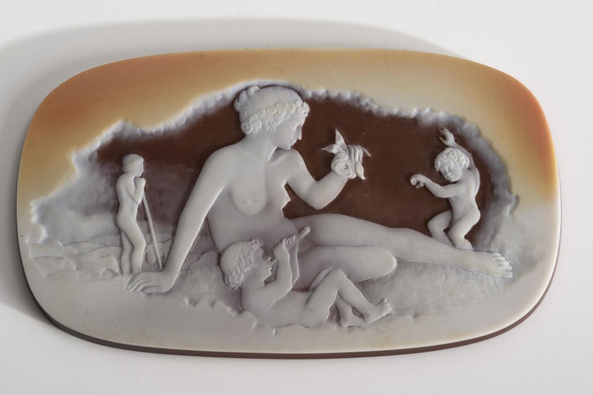 1x shell cameo in wooden frame, 2x milk glass reliefs on coloured glass in brass frame, multilayered glass with ground glass image. Cameo 4,5 x 3,5 cm, frame 9,5 x 8,5 cm.