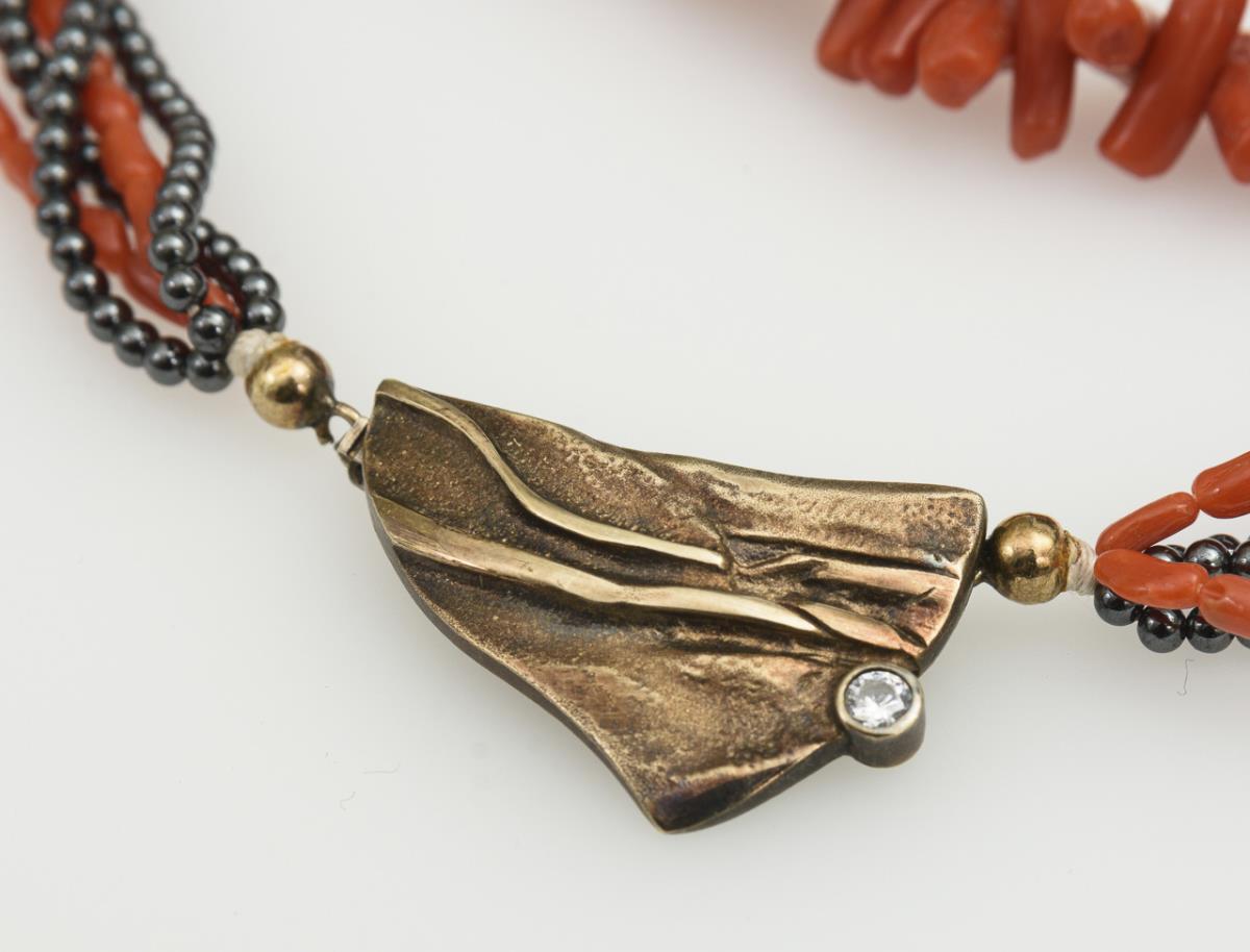 Lacing necklace with coral sticks on metal ring spring clasp. 5-row lace-up necklace with shaematite and coral on decorative clasp.