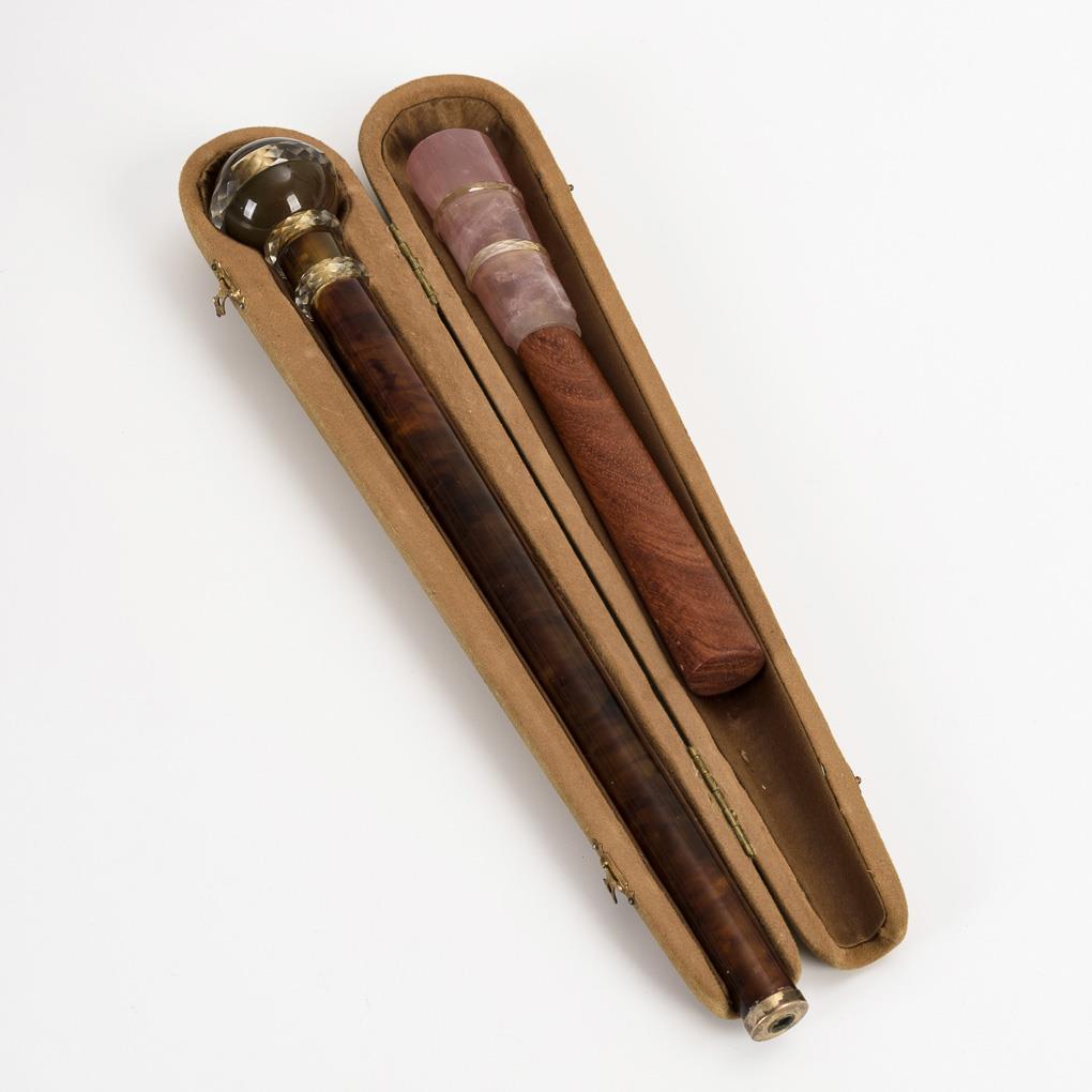 Agate ball and rose quartz rod, respectively; each with faceted rock crystal rings. Weft attachment of tortoiseshell(?) or mahogany, beige case. Mahogany probably supplemented; missing cuff here. Minimal hairline cracks on the tortoiseshell(?), slight signs of age/use on the case.