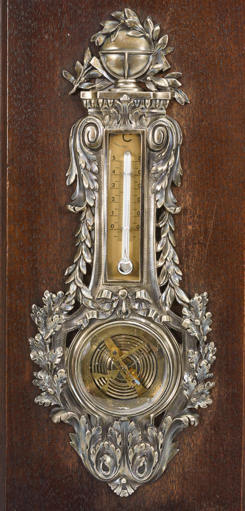 Richly relieved barometer with mercury thermometer. Mounted on wooden plate. Function not tested. / Sidewinder with silver mounting and engraved dedication in English. In brown casket.