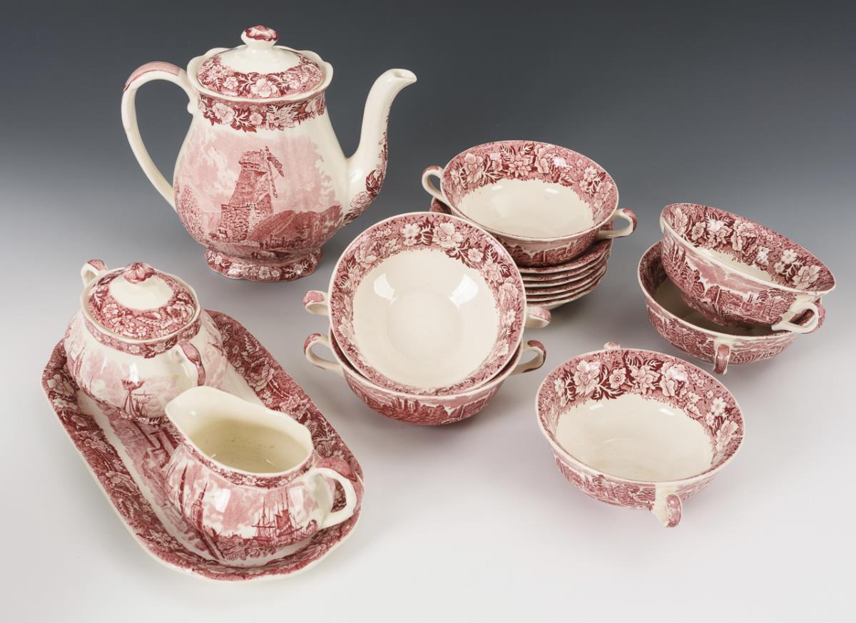 Earthenware, white glazed, iron-red overprint decoration with English landscape and town motifs. H max 19.5 cm, L max 33 cm.