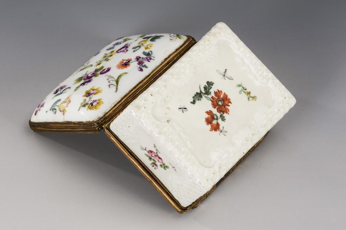 Rectangular box with basket relief as well as floral and insect painting in the cartouches, metal mounted, supplemented hinged lid with floral relief as well as a painted flower basket inside the lid. Lid glued, body restored, partial paint chipping.