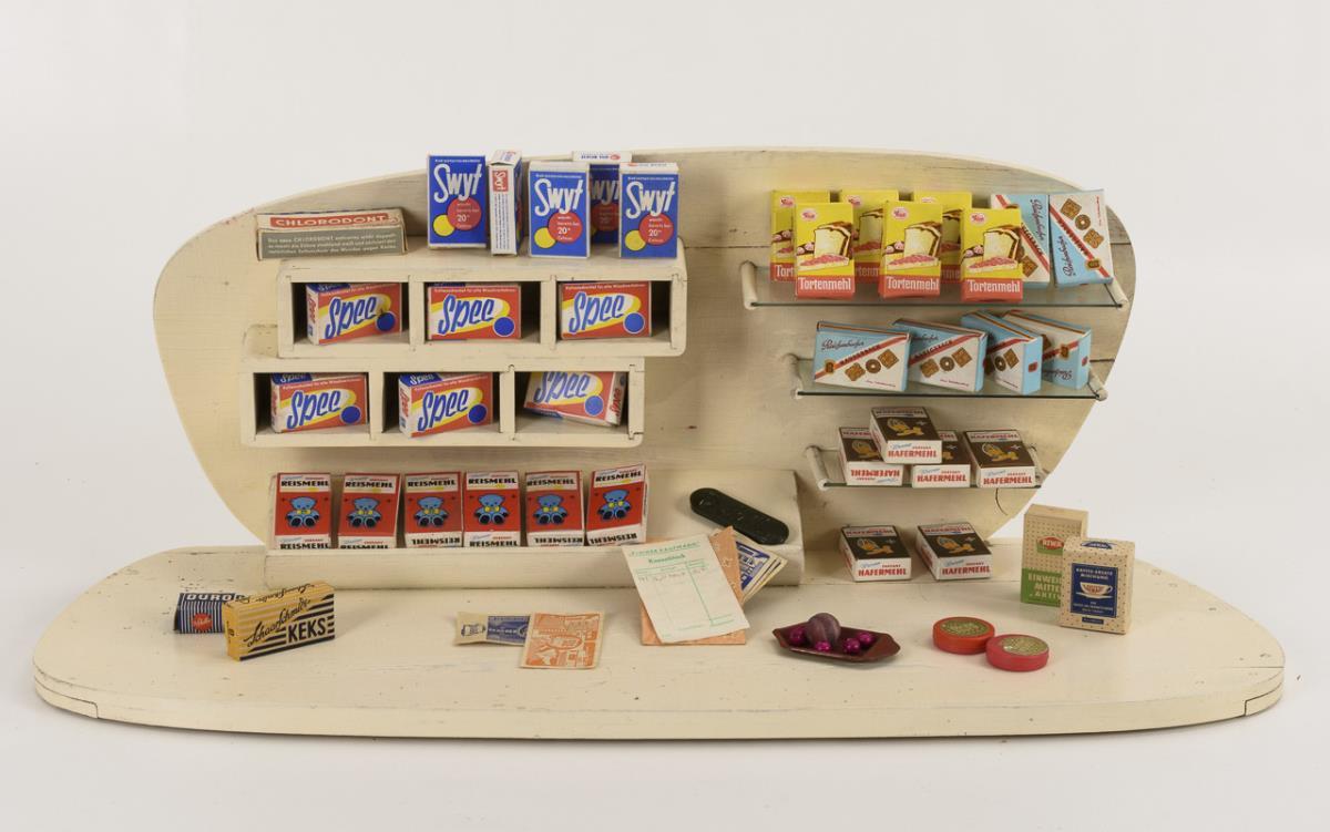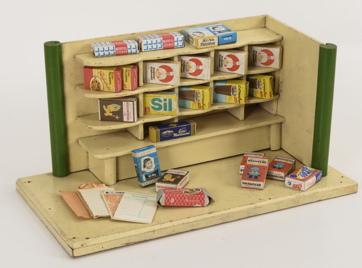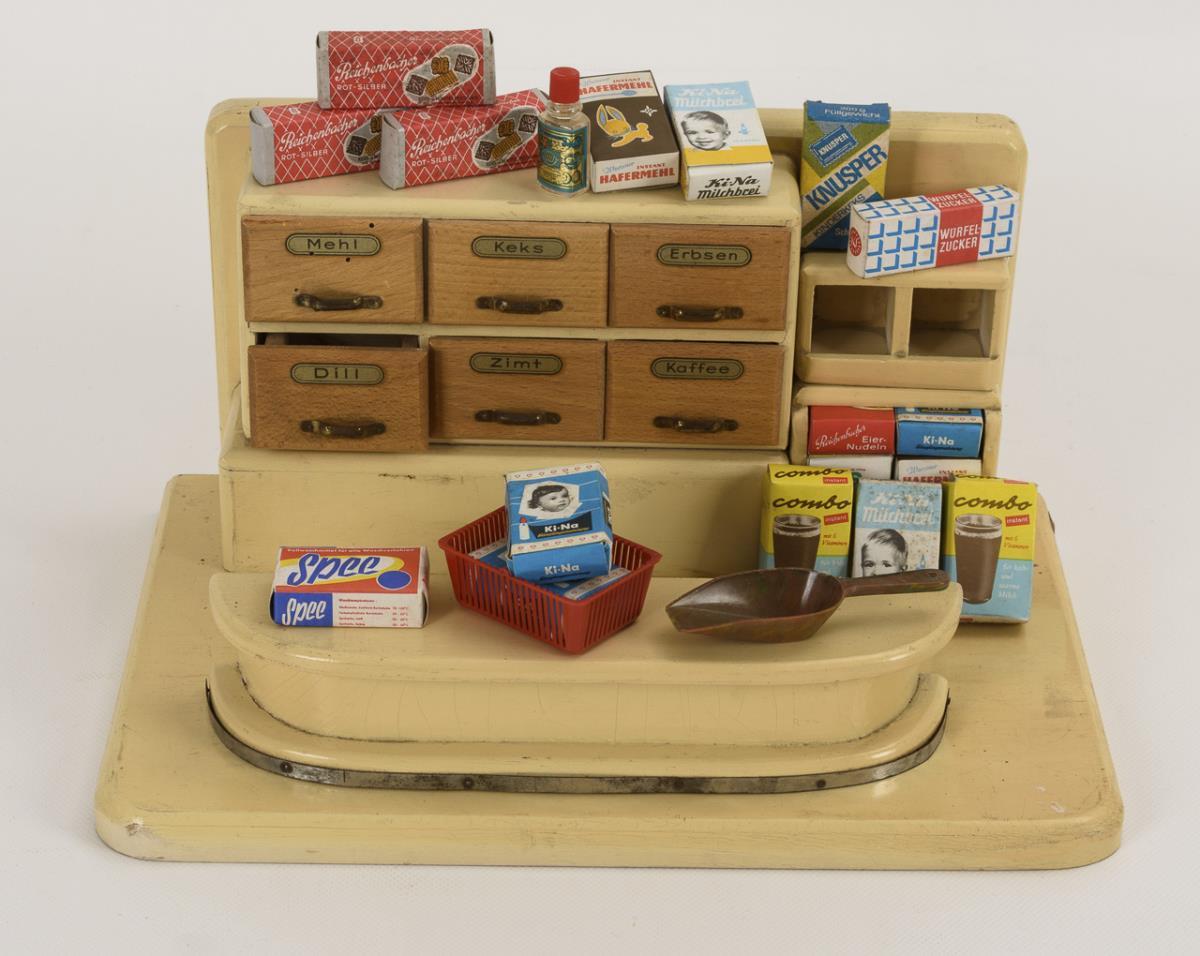 3 open merchant stores with fixed shelf or drawer fixtures. 1x with loosely set counter. In addition, some cardboard boxes and accessories. Slight signs of age.