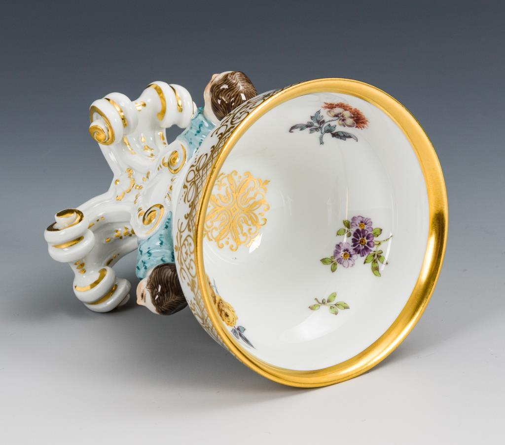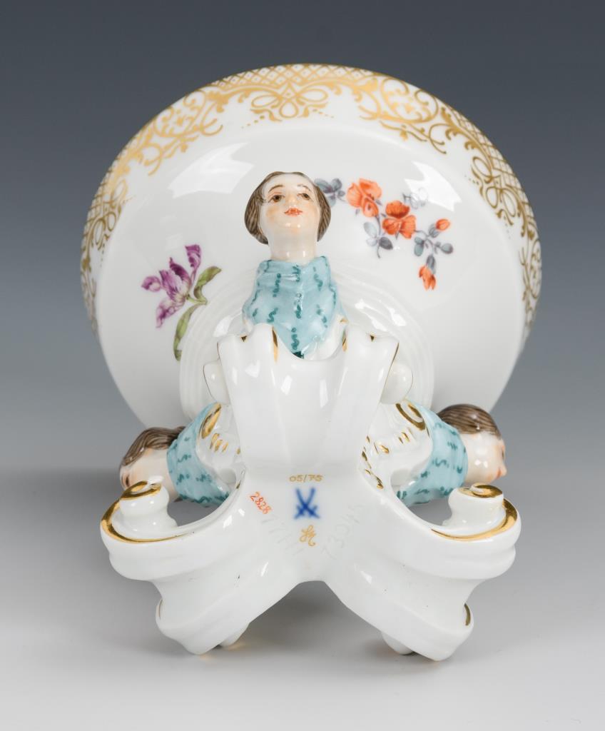 Dreibeiniger Schaft mit gerollten Blattfüßen und drei aus dem Nodus wachsenden weiblichen Hermen, als Aufsatz ein Korb mit Blumenmalerei.