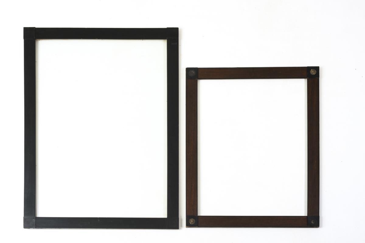 Wide flat wood moldings with applied corner squares; 1x with rosettes. 2 rosettes missing, signs of age/use.